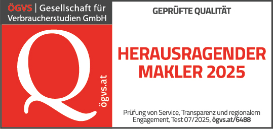 Über das Qualitätssiegel als „Herausragender Makler 2025“ von der ÖGVS - Gesellschaft für Verbraucherstudien mbH, freuen wir uns sehr. Denn mit deren Qualitäts-Prüfung werden Service, Transparenz und Qualität sowie soziales bzw. regionales Engagement für den Verbraucher garantiert.