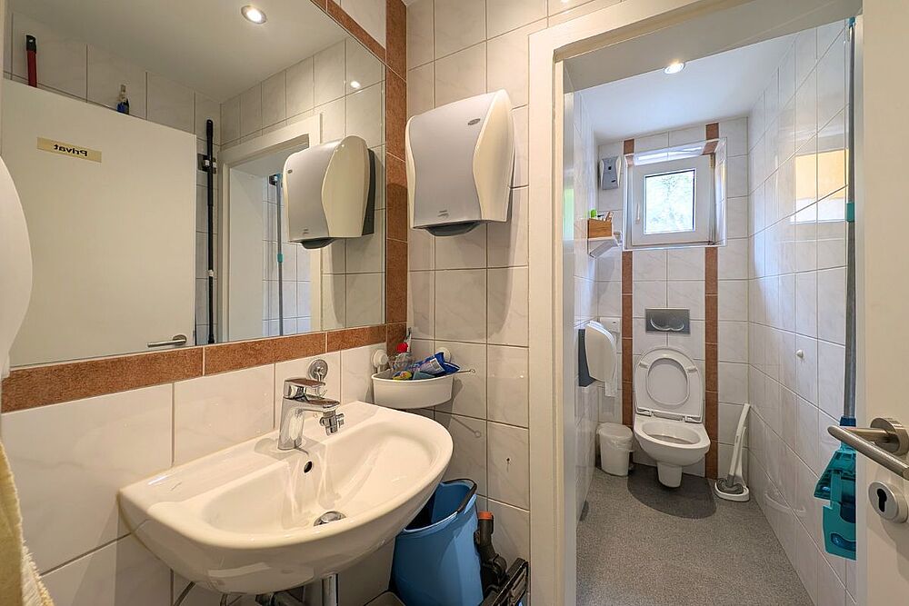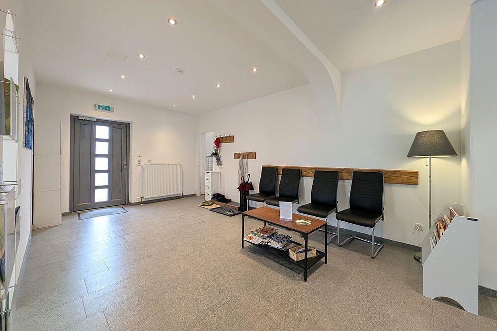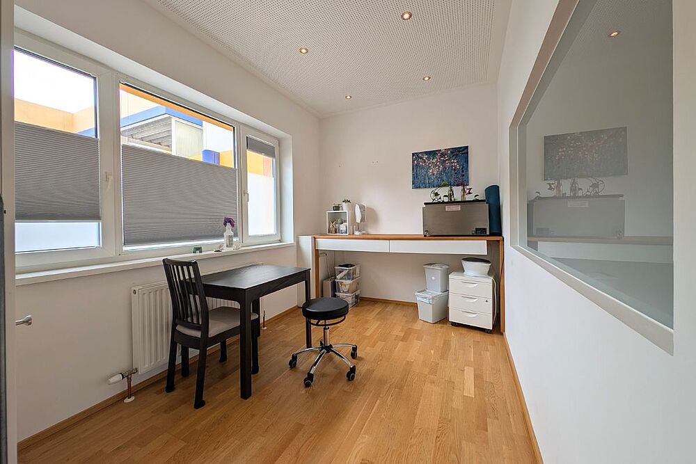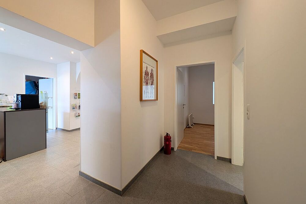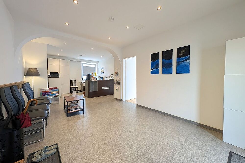 Die Einheit bietet vier helle, gut geschnittene Räume, einen einladenden Empfangs- und Wartebereich sowie zwei getrennte WCs. Ideal geeignet für Praxis, Büro oder Dienstleistungsunternehmen.