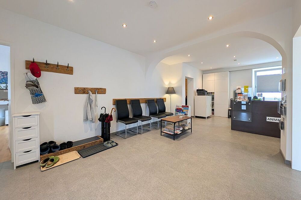Die Einheit bietet vier helle, gut geschnittene Räume, einen einladenden Empfangs- und Wartebereich sowie zwei getrennte WCs. Ideal geeignet für Praxis, Büro oder Dienstleistungsunternehmen.